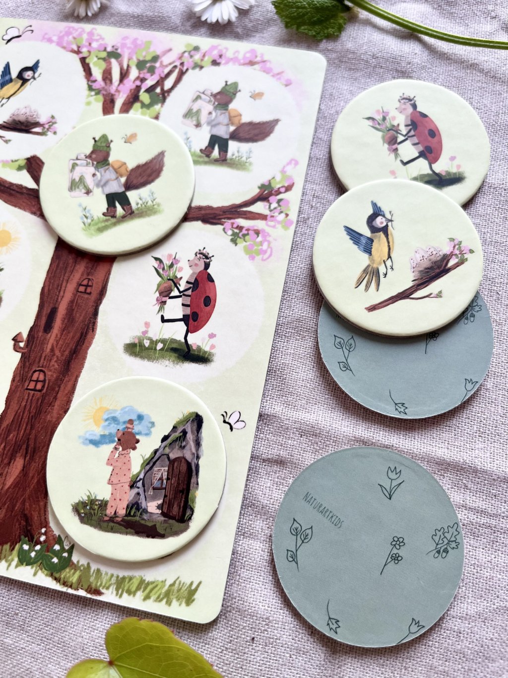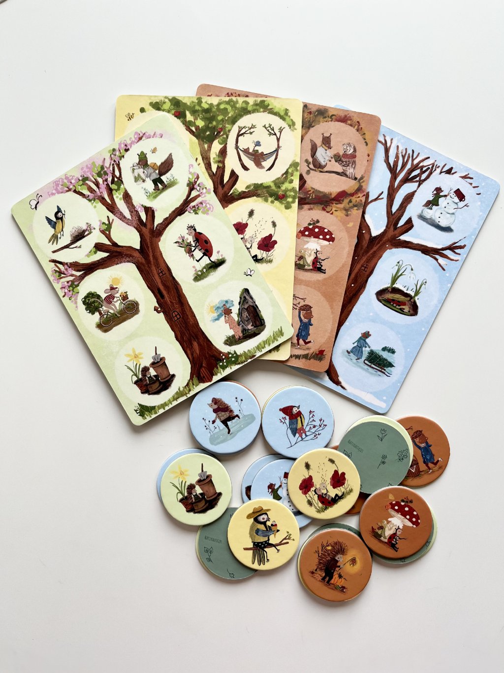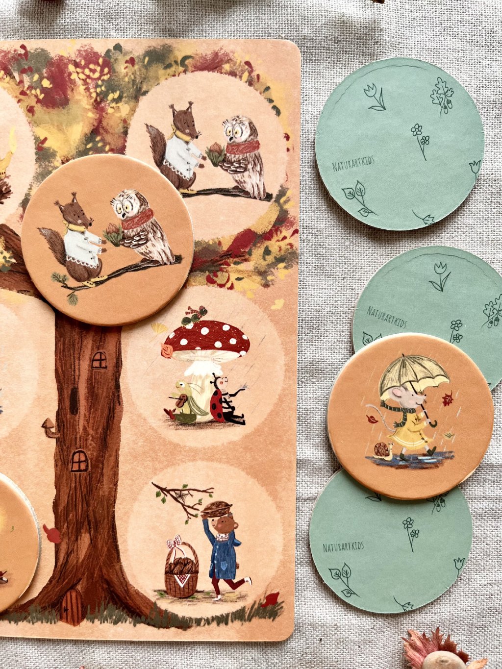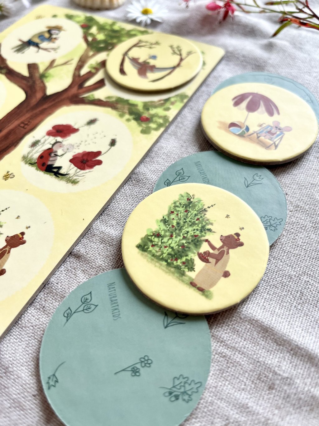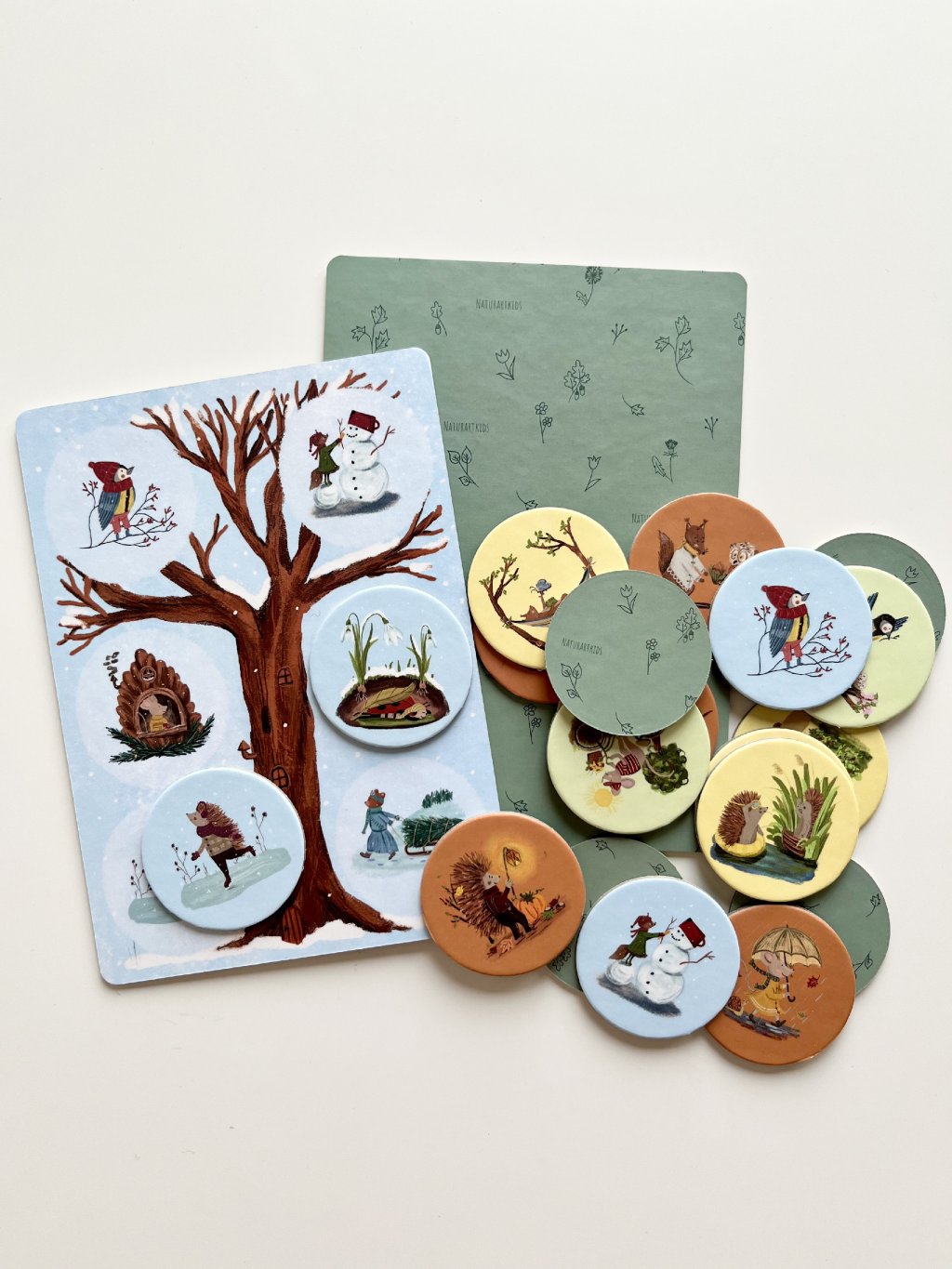 • Párosítás (2+ éves kortól): Párosítsátok a korongokat a megfelelő évszakos táblákhoz, fejlesztve a megfigyelőképességet és a figyelmet.