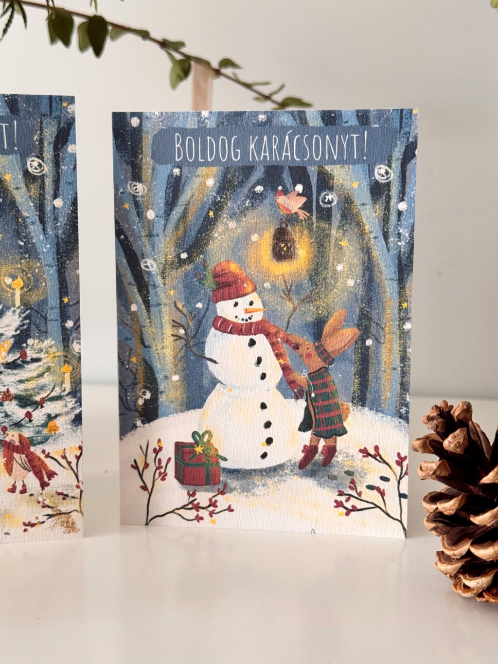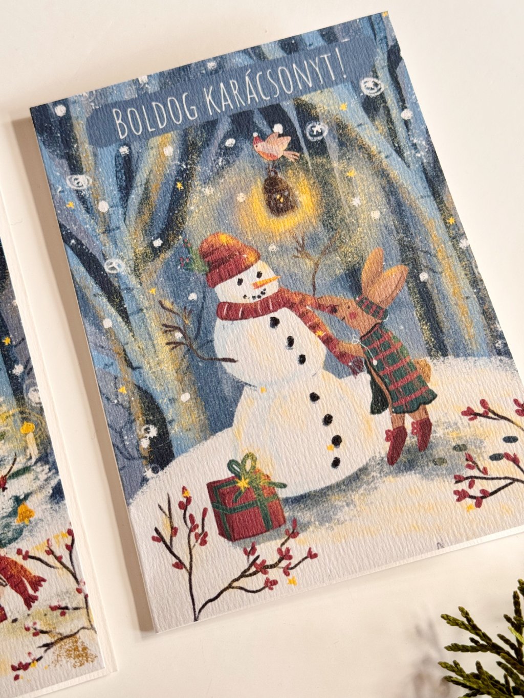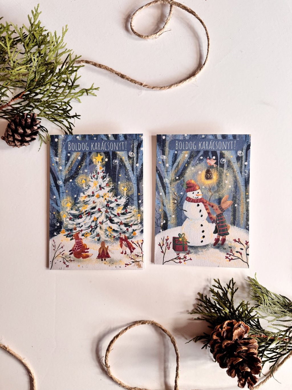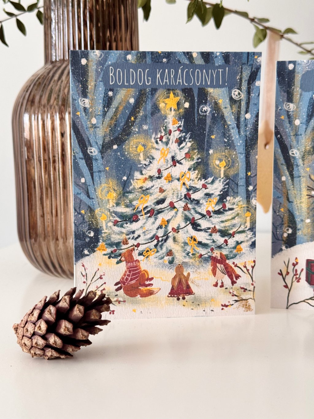 Karácsonyi képeslap szett, amely 2 darab kinyitható képeslapot és 2 darab natúr borítékot tartalmaz.